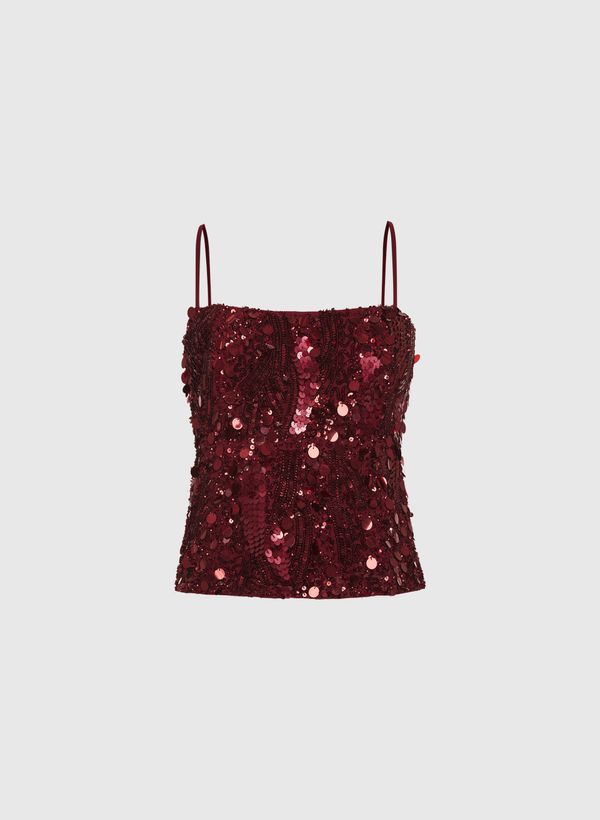 A Regata é confeccionada em viscose, possui bordado com paetês, decote reto, alças finas, fechamento lateral por zíper invisível e acabamento pespontado.