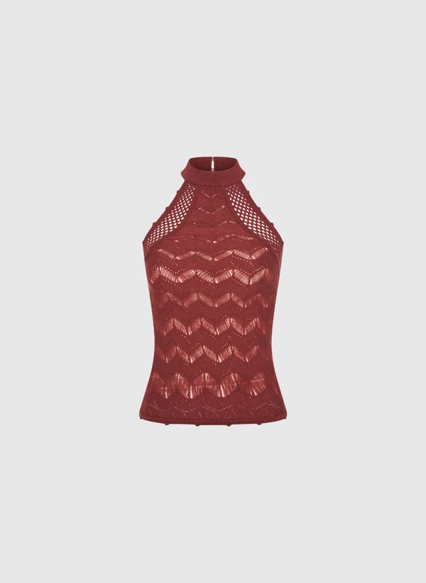 A Regata é confeccionada em tricot em fio de viscose e padronagem geométrica, possui transparência, tela vazada na altura da cava raglan, decote frente única, fechamento na gola por botões, forro modelo top anel com elástico e acabamento scalops em tricot.