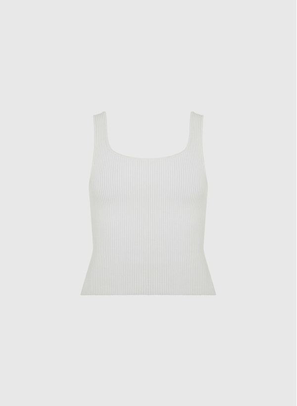 Peças básicas de tricot são essenciais, para compor looks elegantes. Use a Regata Livia com um shorts saia, acessórios metalizados e scarpin slingback, para um visual cool e trendychic.