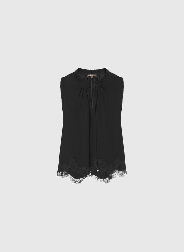 A Regata é confeccionada em renda, possui decote redondo, alças médias, recorte vazado, cordão para amarração e acabamento pespontado.