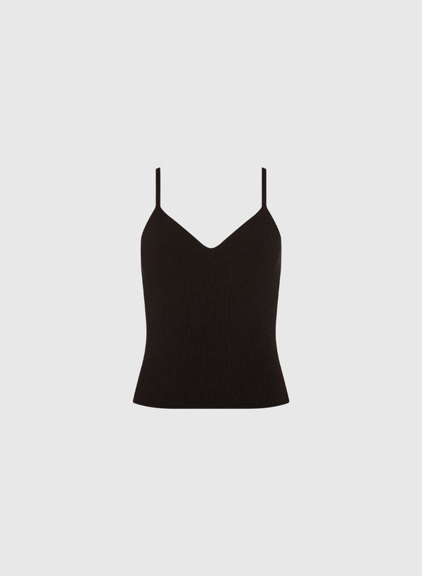 A Regata é confeccionada em tricot, possui modelagem justa ao corpo, decote em "V", alças finas e acabamento canelado.