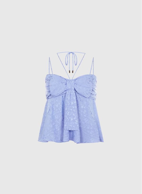 Confeccionada em viscose, a Regata possui padronagem jacquard, decote coração, alças finas, laço frontal, detalhes plissados, fechamento posterior por amarração e zíper,
