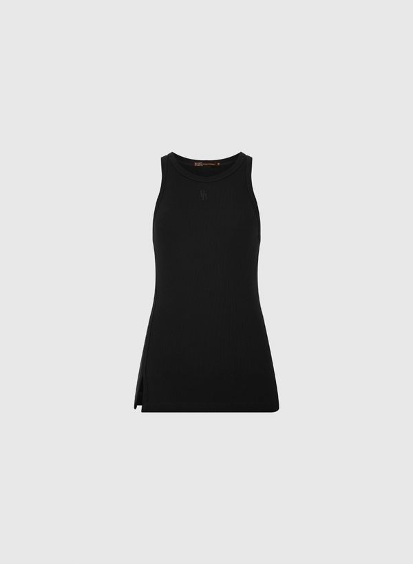 A Regata é confeccionada em malha rib, possui decote nadador, logo centralizado em silk, fenda lateral e acabamento pespontado.