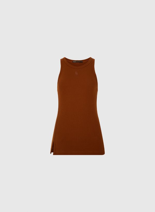 A Regata é confeccionada em malha rib, possui decote nadador, logo centralizado em silk, fenda lateral e acabamento pespontado.