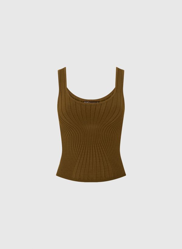 A Regata é confeccionada em fio de viscose com o ponto de tricot, possui decote levemente em U, alças médias e acabamento canelado.