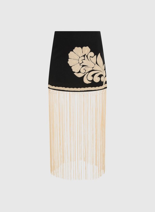 A Saia é confeccionada em tecido plano, possui bordado manual texturizado em contraste com padronagem floral e aplicações de miçangas, barra com aplicação de franjas alongadas em macramê, fechamento posterior por zíper invisível, comprimento curto e acabamento pespontado.