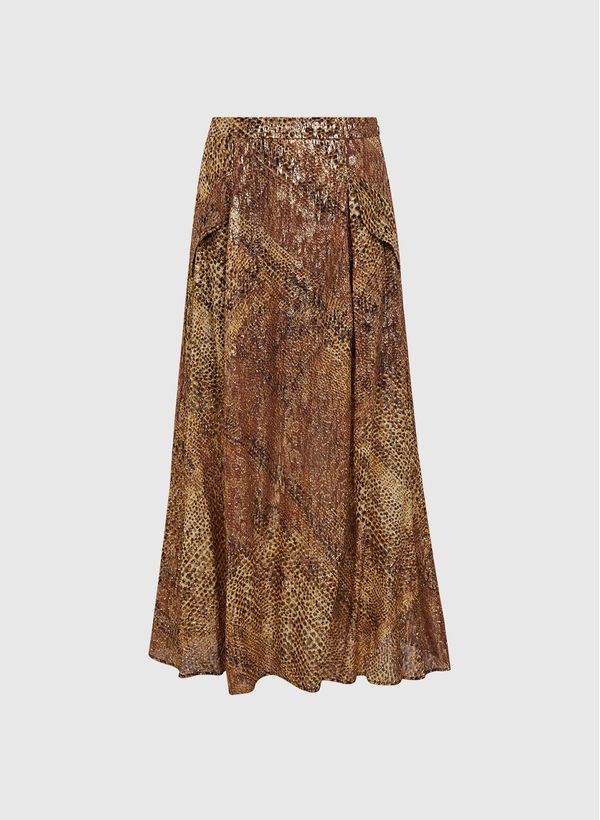 Confeccionada em tecido plano texturizado, a Saia possui padronagem estampada, modelagem evasê, cós aplicado com elástico, dois bolsos falsos laterais com lapela, comprimento midi e acabamento pespontado.