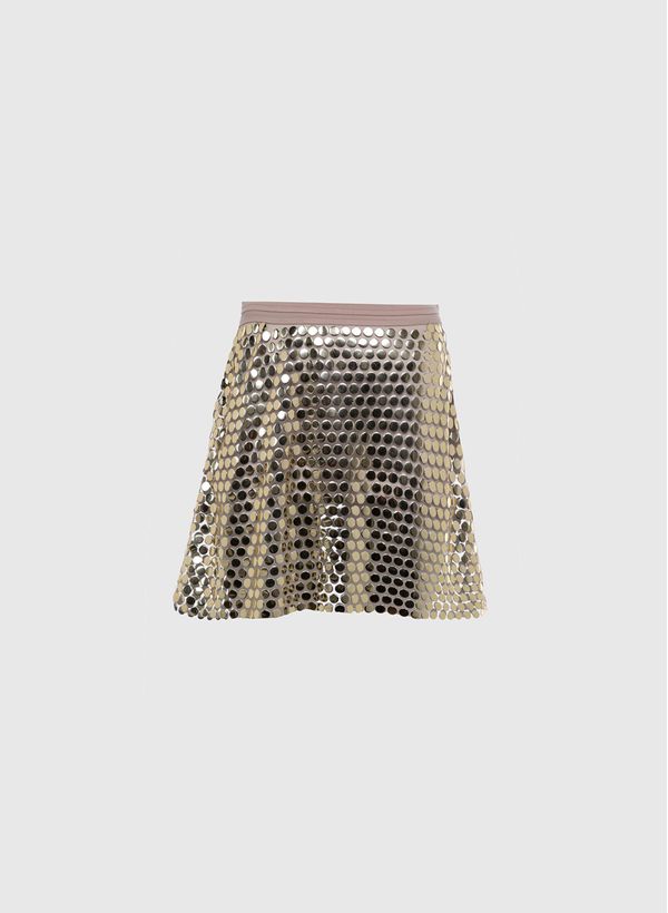 A Saia é confeccionada em tule de poliamida com aplicação metálica, modelagem reta, comprimento curto e fechamento lateral por zíper invisível.