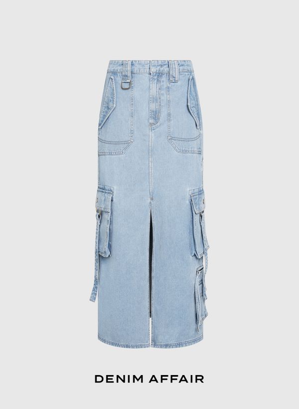 A Saia é confeccionada em jeans com lavagem clara, possui modelo cargo, cós com passantes e detalhe de argola aplicada, dois bolsos frontais modelo faca, três bolsos laterais com lapelas e abotoamento com detalhes de argolas e faixas, zíper decorativo lateral, dois bolsos posteriores, fechamento frontal por zíper e botão, fenda frontal, comprimento midi e acabamento pespontado.