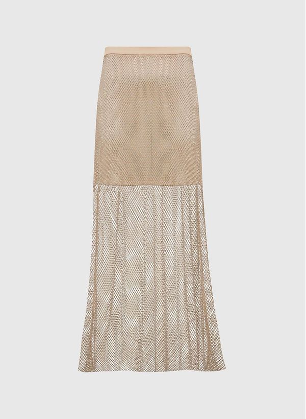 Confeccionada em malha, a Saia possui superfície telada com cristais aplicados e transparência, cós fino com cintura alta, forro curto embutido e comprimento longo.