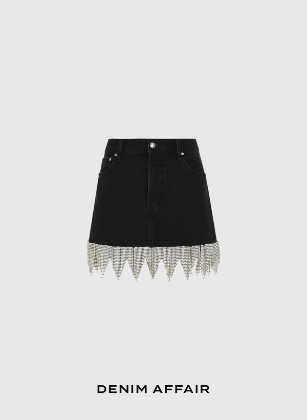 A Saia é confeccionada em jeans, possui lavagem escura, modelagem reta, cós com passantes, cinco bolsos, barra com franjas de pedrarias, fechamento frontal por zíper e botão, comprimento curto e acabamento pespontado.