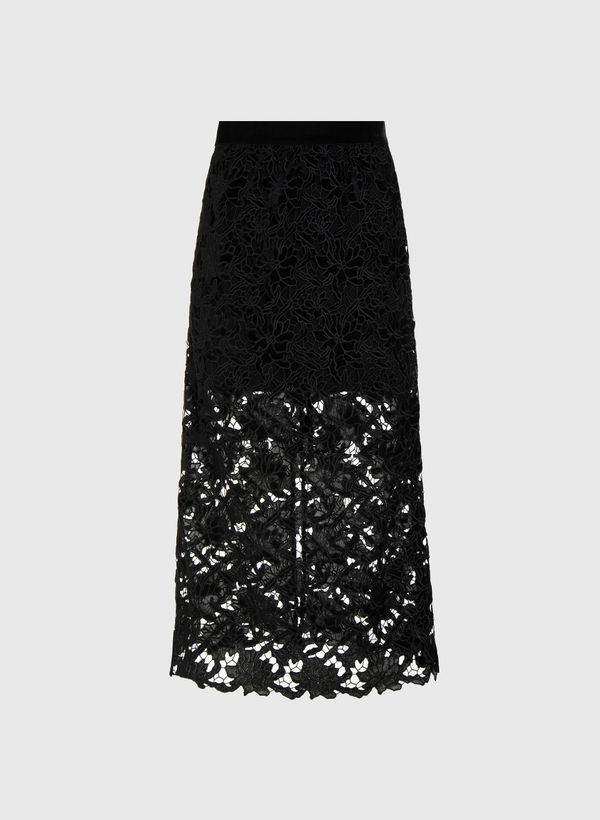 A Saia é confeccionada em renda de veludo, possui transparência, cós aplicado, fechamento posterior por zíper invisível, comprimento midi e acabamento pespontado.