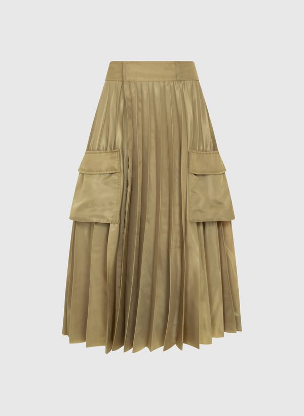A Saia é confeccionada em nylon, possui modelagem de alfaiataria, shape evasê, cós com passantes, dois bolsos amplos com lapelas, pregas plissadas por toda peça, martingales laterais, fechamento frontal por colchetes e botão, forro interno, comprimento midi e acabamento pespontado.