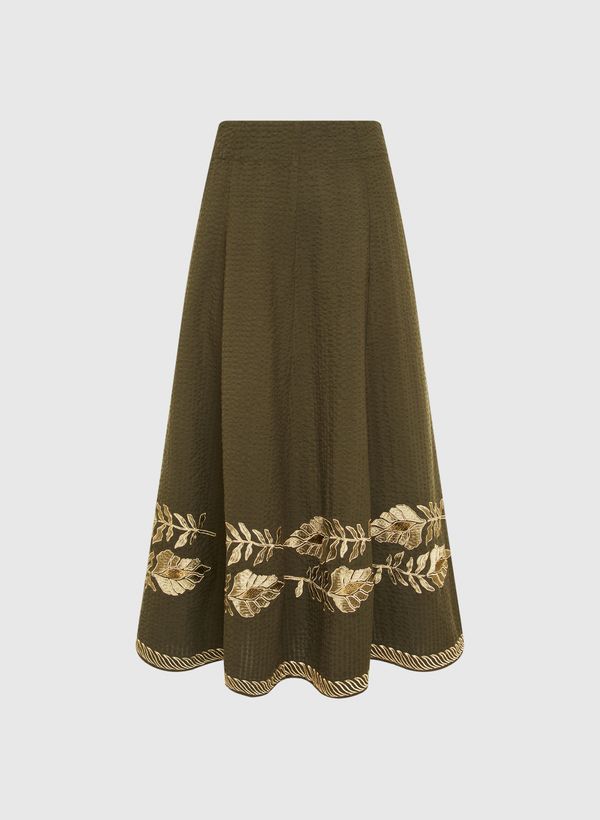 A Saia é confeccionada em tecido plano texturizado, possui bordado maquinetado com fios de lurex, modelagem evasê, fechamento lateral por zíper invisível, comprimento midi e acabamento pespontado.