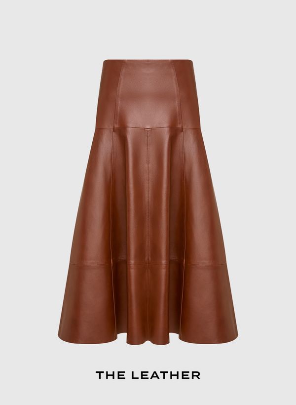 A Saia é confeccionada em couro, possui modelagem evasê, shape godê, comprimento midi, fechamento posterior por zíper e acabamento pespontado.
