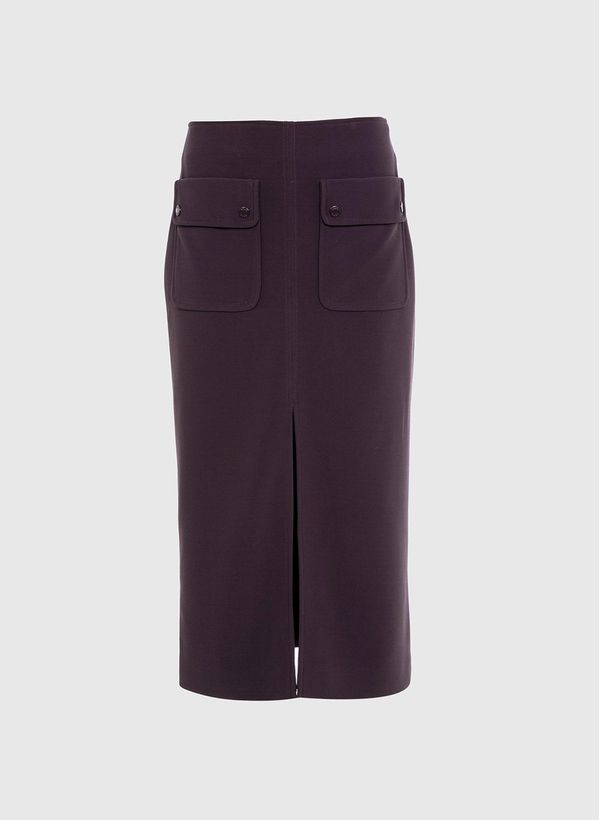 A Saia é confeccionada em malha, possui caimento reto, dois bolsos frontais, fenda frontal, comprimento midi e acabamento pespontado.