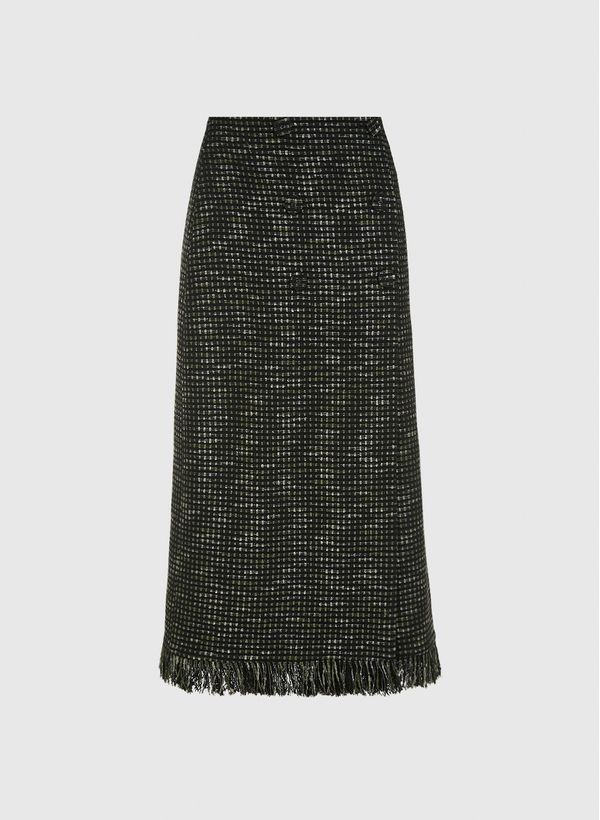 A Saia é confeccionada em tweed, possui modelo alfaiataria, modelagem evasê, cintura alta, fechamento frontal por botões revestidos, comprimento midi e barra desfiada.
