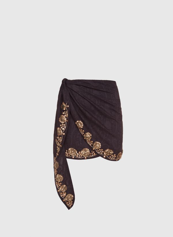 A Saia é confeccionada em tecido plano com padronagem jacquard, possui bordado manual floral e linha com paetês metálicos, shape pareô com transpasse e amarração lateral, comprimento curto e acabamento pespontado.