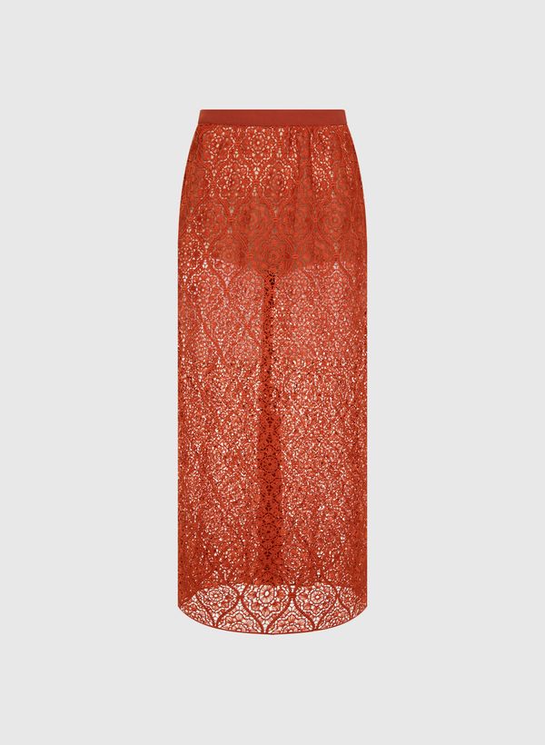 A Saia é confeccionada em renda guipir com padronagem floral, possui transparência, cós aplicado, fenda posterior, fechamento posterior por zíper invisível, forro interno curto e comprimento midi.
