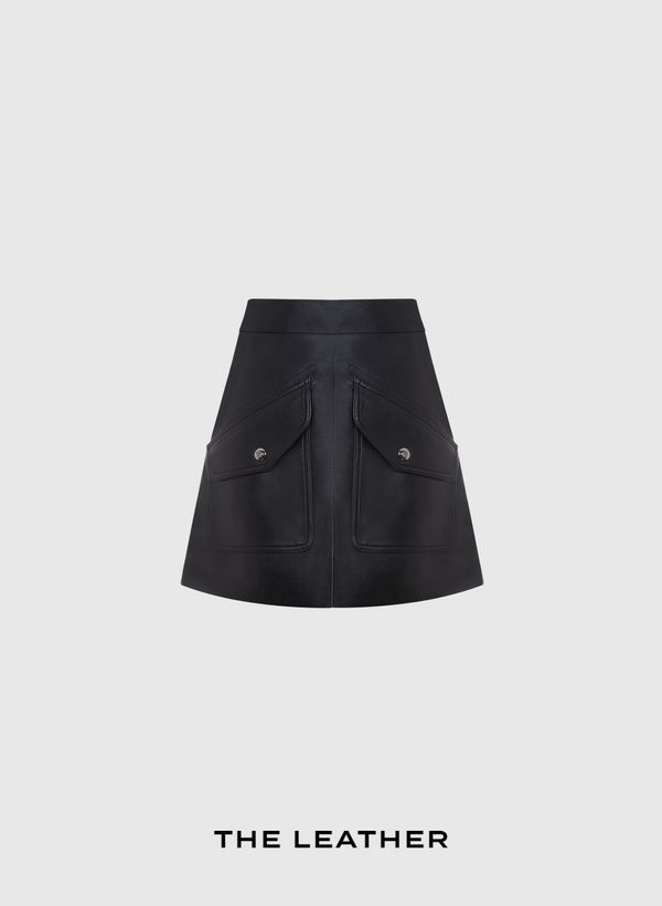 Confeccionada em couro italiano, a Saia possui modelagem reta, bolsos frontais com fechamento por botão, bolsos posteriores embutidos, comprimento curto e fechamento lateral por zíper.