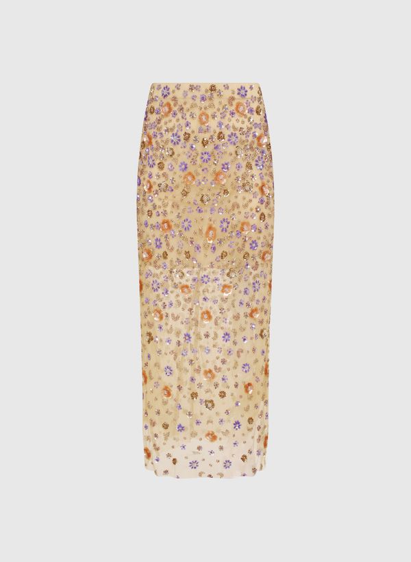 A Saia é confeccionada em malha tule bordada com pedrarias, possui transparência, fechamento lateral por zíper invisível, fenda posterior, forro interno, comprimento midi e acabamento pespontado.