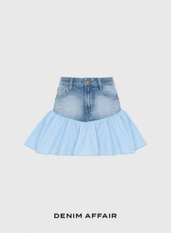 A Saia é confeccionada em jeans e tricoline, possui lavagem clara, cós com passantes, cinco bolsos, fechamento frontal por botão e zíper, comprimento curto e acabamento pespontado.