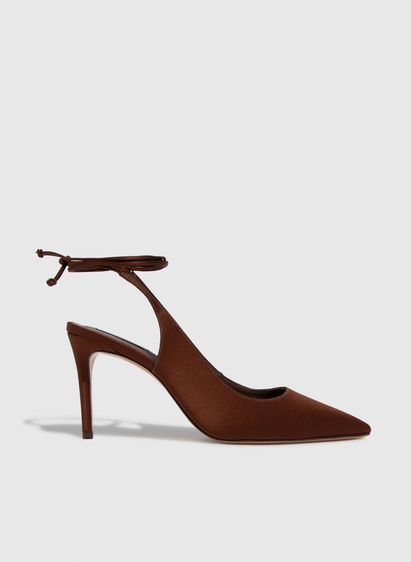 Desenvolvido em Poliéster, o Scarpin possui modelo slingback com as tiras para amarração na parte posterior e salto médio fino.