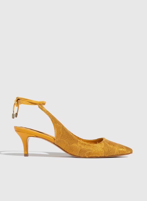 Desenvolvido em jacquard com textura floral com relevo, o Scarpin possui modelo slingback com as tiras para amarração na parte posterior e salto médio fino.