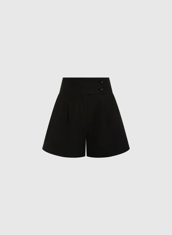 O Shorts é confeccionado em tecido plano com toque de linho, possui modelagem em alfaiataria, cós aplicado com botões, detalhe posterior por tira com fivela, dois bolsos frontais tipo faca, dois bolsos posteriores embutidos, pregas frontais, fechamento frontal por botões de casa e zíper de metal, comprimento curto e acabamento pespontado.