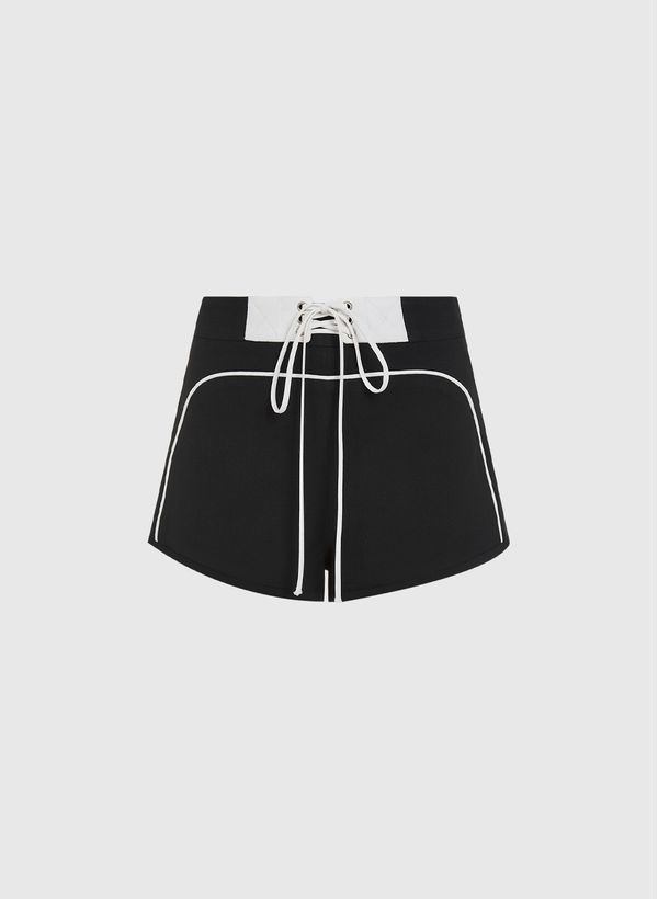 O Shorts é confeccionado em crepe, possui modelagem alfaiataria, cós aplicado com detalhe bicolor sobreposto, fechamento frontal por zíper interno e amarração, detalhe de friso na parte frontal e acabamento pespontado.