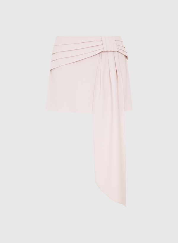 O Shorts Saia é confeccionado em tecido plano, possui modelagem em alfaiataria, drapeado lateral assimétrico composto por pregas sobrepostas, faixa longa aplicada, fechamento posterior por zíper e comprimento curto.