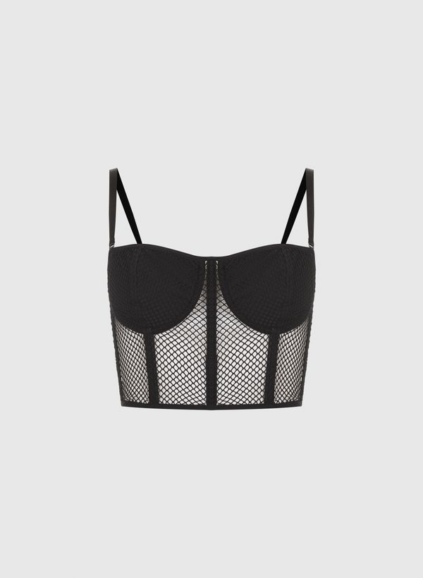 Confeccionado em malha tela arrastão, com transparência, o Top possui caimento ajustado, decote coração, alças finas ajustáveis e removíveis, aros aplicados com forro embutido, recortes verticais, fechamento posterior por zíper e acabamento pespontado.
