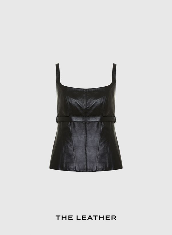 O Top é confeccionado em couro, possui decote reto, alças finas, cintura com passantes, fechamento posterior por zíper, forro interno e acabamento pespontado.