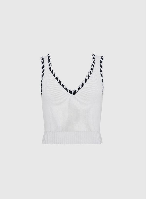 Confeccionado em tricot, o Top possui caimento reto, decote V, alças médias, tag posterior da marca, bordados no decote e alças e acabamento canelado.