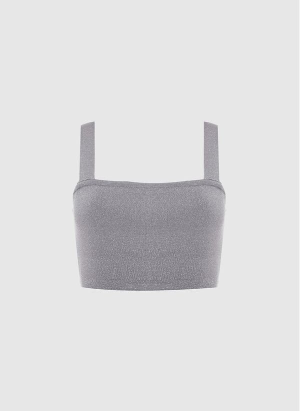 Confeccionado em tricot com efeito metalizado, o Top possui decote reto, alças médias e acabamento canelado.