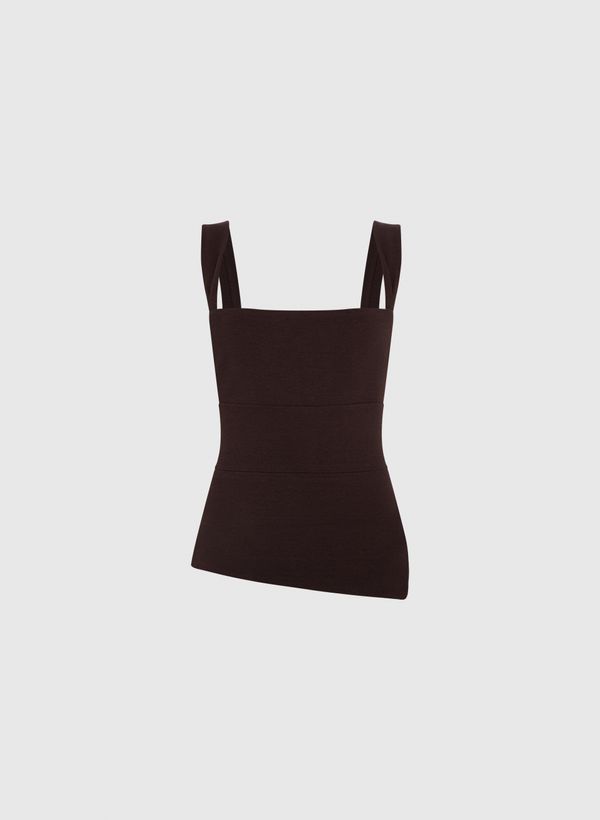 O Top é confeccionado em malha, possui caimento ajustado, decote reto, alças médias, fenda lateral e acabamento pespontado.