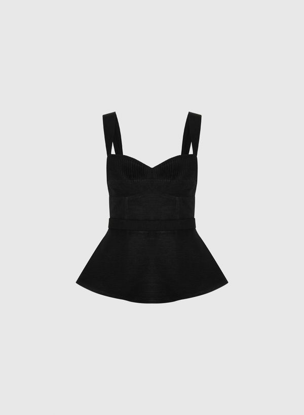 O Top é confeccionado em linho, possui caimento ajustado, modelagem basque, decote em "V", alças médias, detalhes franzidos, lastex nas costas, fechamento posterior por zíper invisível e acabamento pespontado.