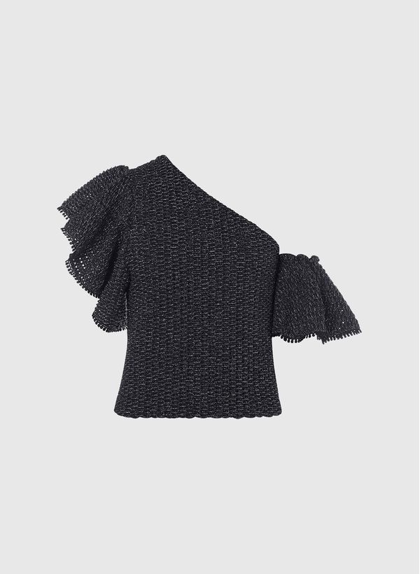 Confeccionada em malha com fios de lurex, a Blusa possui decote assimétrico, mangas com babados com detalhe da manga inferior ser removível e acabamento pespontado.
