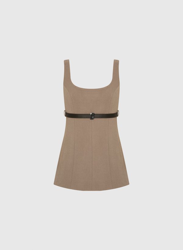 O Top é confeccionado em crepe twill, possui modelagem em alfaiataria, decote reto, alças médias, recortes estruturais nas laterais, cinto com passantes, comprimento alongado, fechamento posterior por zíper invisível e acabamento pespontado.