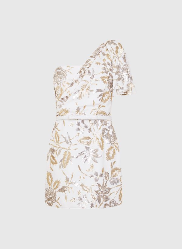 O Vestido é confeccionado em tecido plano com linho, possui bordado floral de paetês, modelagem ajustada ao corpo, decote assimétrico transpassado de um ombro só e manga ampla drapeada, fechamento lateral por zíper invisível, forro fixo na peça, comprimento curto e acabamento pespontado.