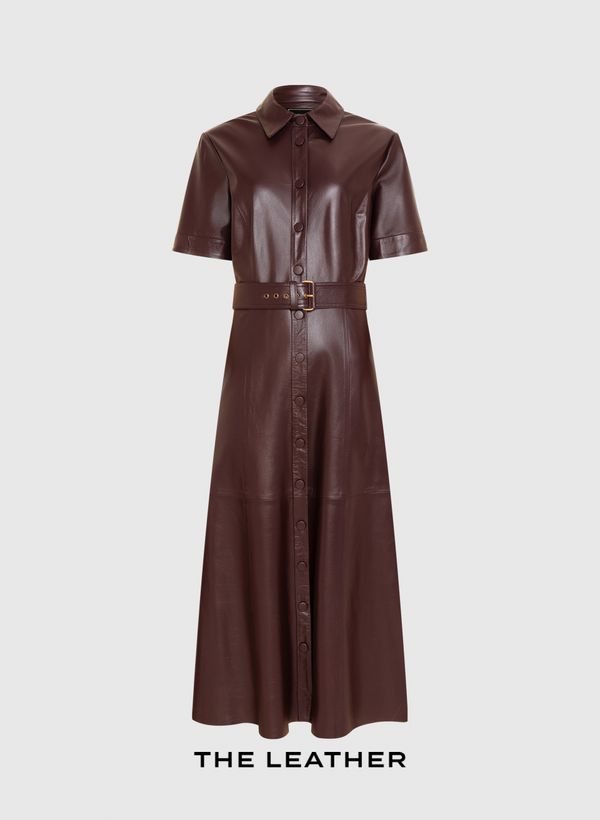 O Vestido é confeccionado em couro, possui modelagem evasê, caimento acinturado, gola com colarinho, mangas curtas, fechamento frontal por botões revestidos, dois bolsos frontais tipo faca, cintura com passantes, forro interno, comprimento midi e acabamento pespontado.
