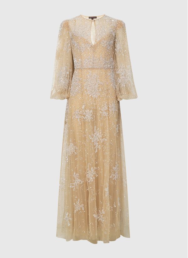 O Vestido é confeccionado em tule bordado à mão com paetês, possui modelagem evasê, caimento acinturado, decote redondo com detalhe vazado no formato gota e fechamento por botão de casa, mangas longas bufantes com elástico nos punhos, forro interno, comprimento longo e acabamento pespontado.