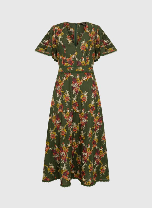 O Vestido é confeccionado em tecido plano, possui bordado aplicado, decote em "V", mangas curtas, fechamento posterior por zíper invisível, barra e mangas com entremeios, comprimento midi e acabamento pespontado.