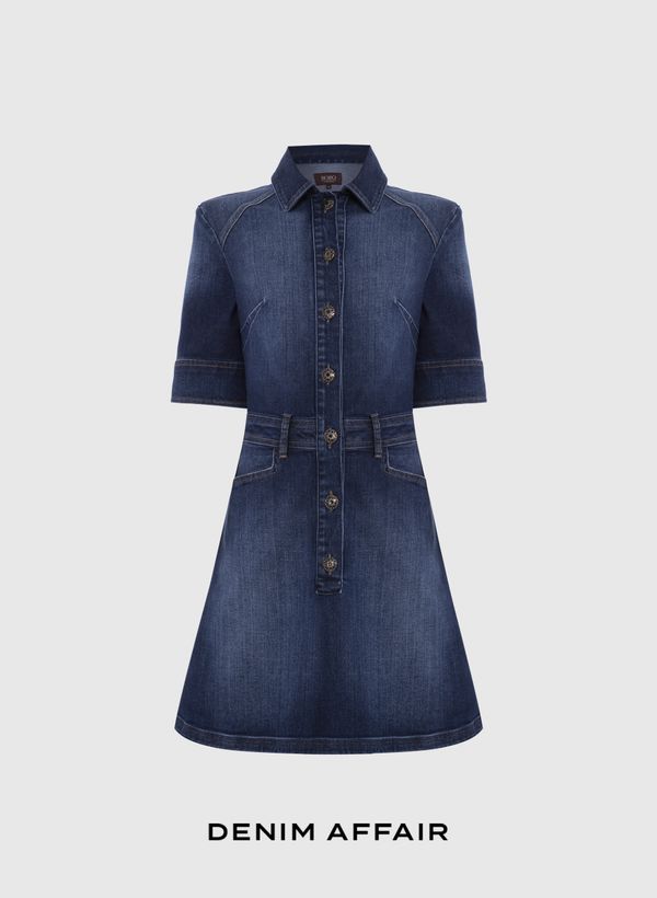 O Vestido é confeccionado em jeans, possui lavagem escura, gola com colarinho, mangas 3/4 com abotoamento por botão, cós com passantes, dois bolsos frontais, fechamento frontal por botão, comprimento curto e acabamento pespontado.