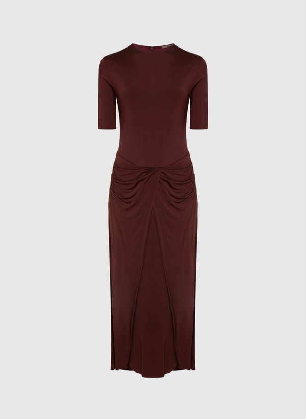 O Vestido é confeccionado em malha, possui caimento reto, decote redondo, mangas curtas, pala frontal com detalhes de franzidos, fechamento posterior por zíper invisível, comprimento midi e acabamento pespontado.