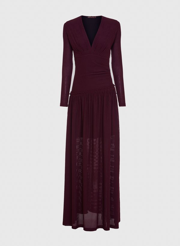 O Vestido é confeccionado em malha, possui modelagem ajustada ao corpo, decote em "V", mangas longas, detalhe transversal na saia com caimento mais amplo, comprimento longo e acabamento pespontado.