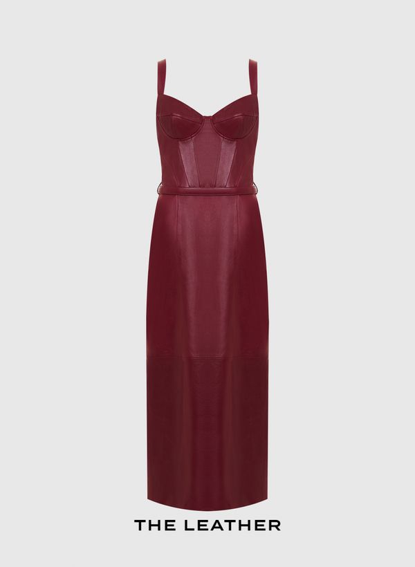 O Vestido é confeccionado em couro italiano, possui modelagem reta, caimento acinturado, alças médias, busto corset, fechamento posterior por zíper, forro interno, comprimento midi e acabamento pespontado.