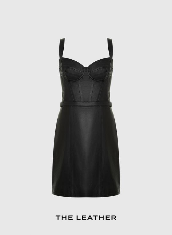 O Vestido é confeccionado em couro italiano, possui caimento reto, busto estilo corset, alças médias ajustáveis, fechamento posterior por zíper invisível, comprimento curto e acabamento pespontado.