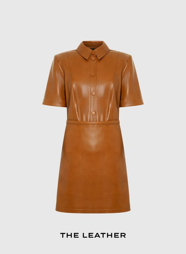 O Vestido é confeccionado couro, possui caimento reto, gola com colarinho, mangas curtas, cós com passantes, fechamento frontal por botões, comprimento curto e acabamento pespontado.