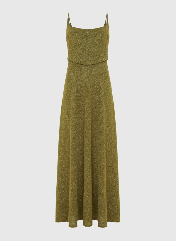 O Vestido é confeccionado em malha com lurex dourado, possui shape godê, decote reto com recortes, alças finas, fechamento posterior por zíper invisível, comprimento longo e acabamento pespontado.